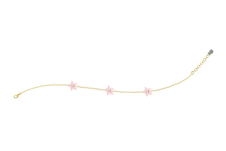 Bracciale in argento 925 con tre stelle rosa, ognuna con al centro una pietra brillante. Sprazzi di luce nel cielo notturno, le stelle ci ricordano che il buio non è mai solo buio. Donare questo bracciale in argento 925 è come irradiare la vita dei bimbi che amiamo.