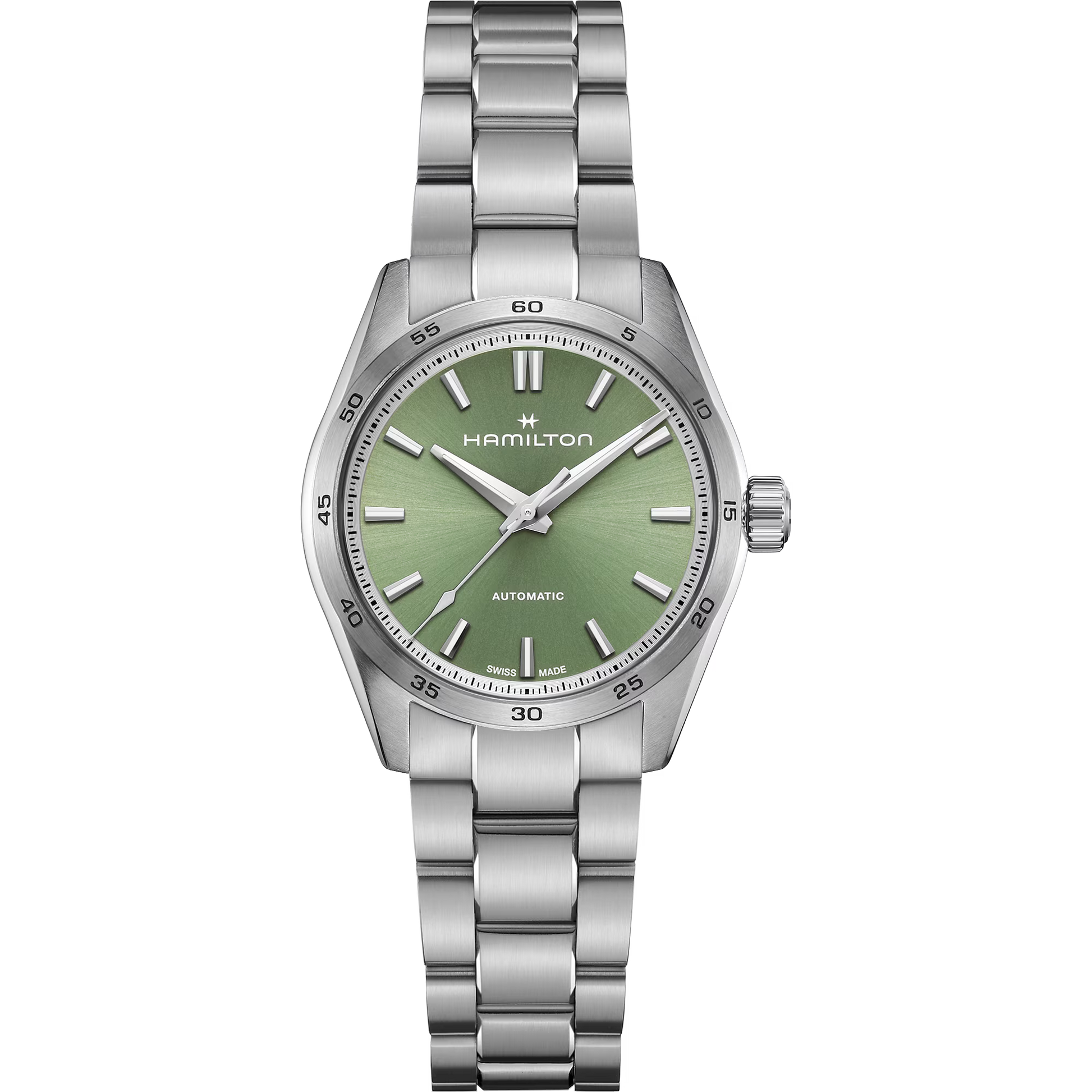 Pensata per chi ama in egual misura funzionalità e stile, la linea Jazzmaster Performer offre una potente estetica sporty-chic. Animato dal movimento automatico H-10 con riserva di carica fino a 80 ore, questo Jazzmaster Performer Automatic presenta una cassa in acciaio da 34 mm messa in risalto da un quadrante verde pistacchio, indici in nichel e un raffinato bracciale in acciaio.