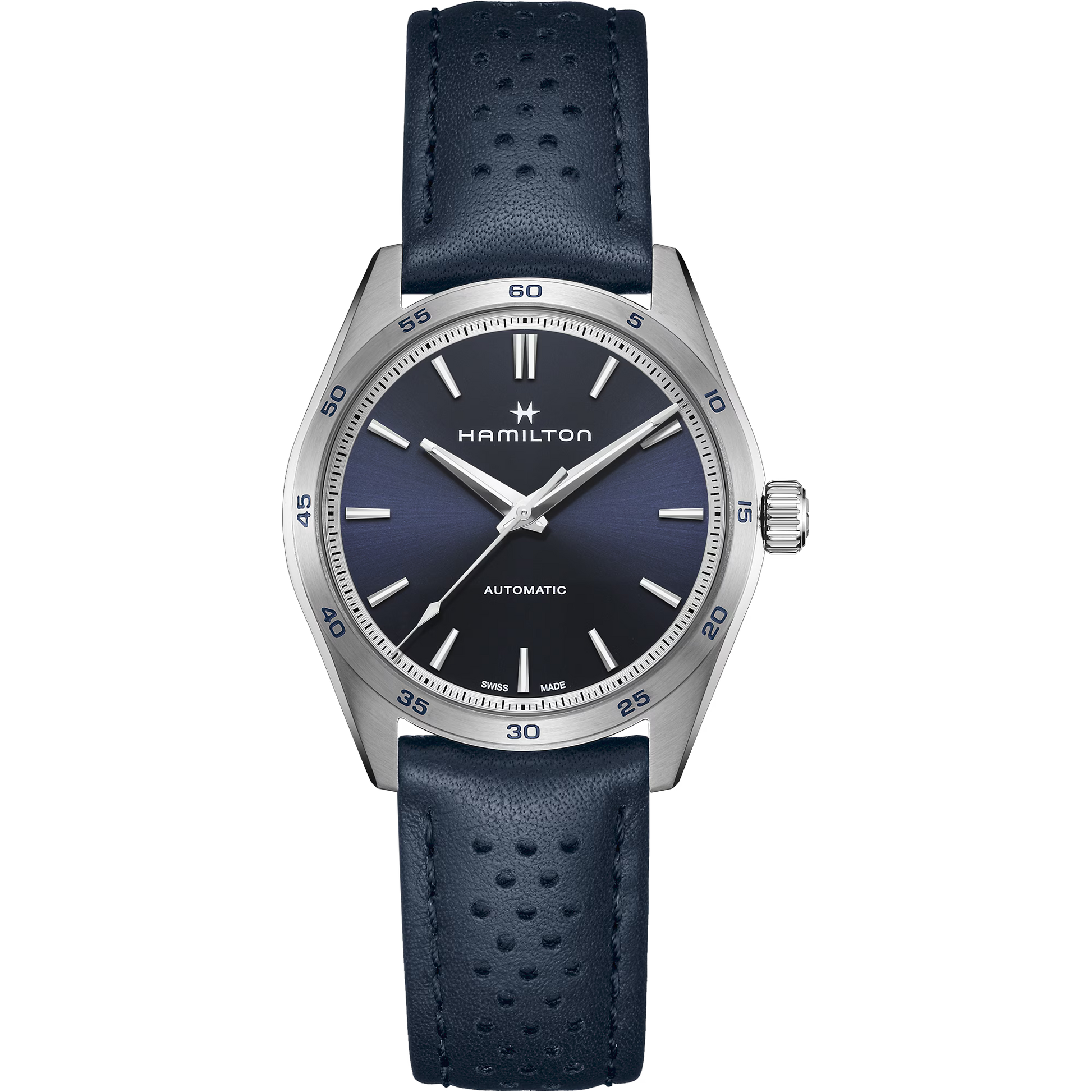 Pensata per chi ama l’equilibrio tra stile e funzionalità, la linea Jazzmaster Performer offre un look sporty-chic accattivante. Animato dal movimento automatico H-10 con riserva di carica fino a 80 ore, questo Jazzmaster Performer Automatic presenta una cassa in acciaio da 38 mm messa in risalto da un sobrio quadrante blu e un cinturino in pelle blu traforata coordinato, ispirato alle corse automobilistiche.