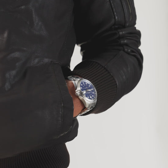 Realizzato pensando agli appassionati di aviazione, il Khaki Aviation Pilot Day Date richiama immediatamente lo spirito di esplorazione e di avventura del Khaki. Animato dal movimento automatico H-30 con riserva di carica di 80 ore e spirale in Nivachron™, questo modello presenta sul quadrante un datario e dei numeri sovradimensionati, per una maggiore leggibilità. Il Khaki Aviation Day Date 42 mm è completato da un bracciale sobrio in acciaio, abbinato a un quadrante blu scuro, per ricordare le infinite possibilità che offre il cielo.