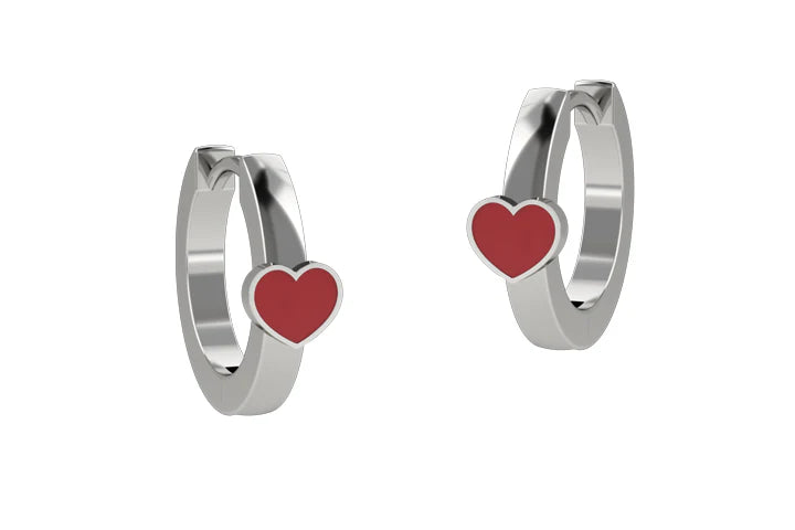 Coppia di orecchini a cerchio con un dolce cuore smaltato in rosso