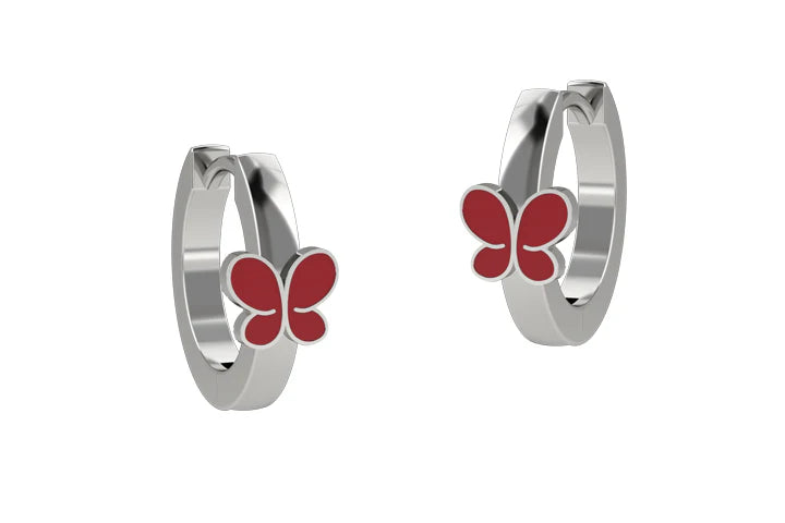 Coppia di orecchini a cerchio con una dolce farfalla smaltata in rosso