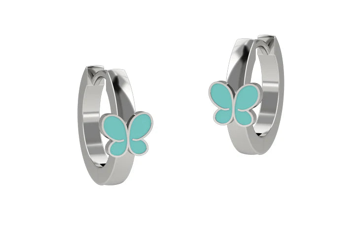 Coppia di orecchini a cerchio con una dolce farfalla smaltata in azzurro
