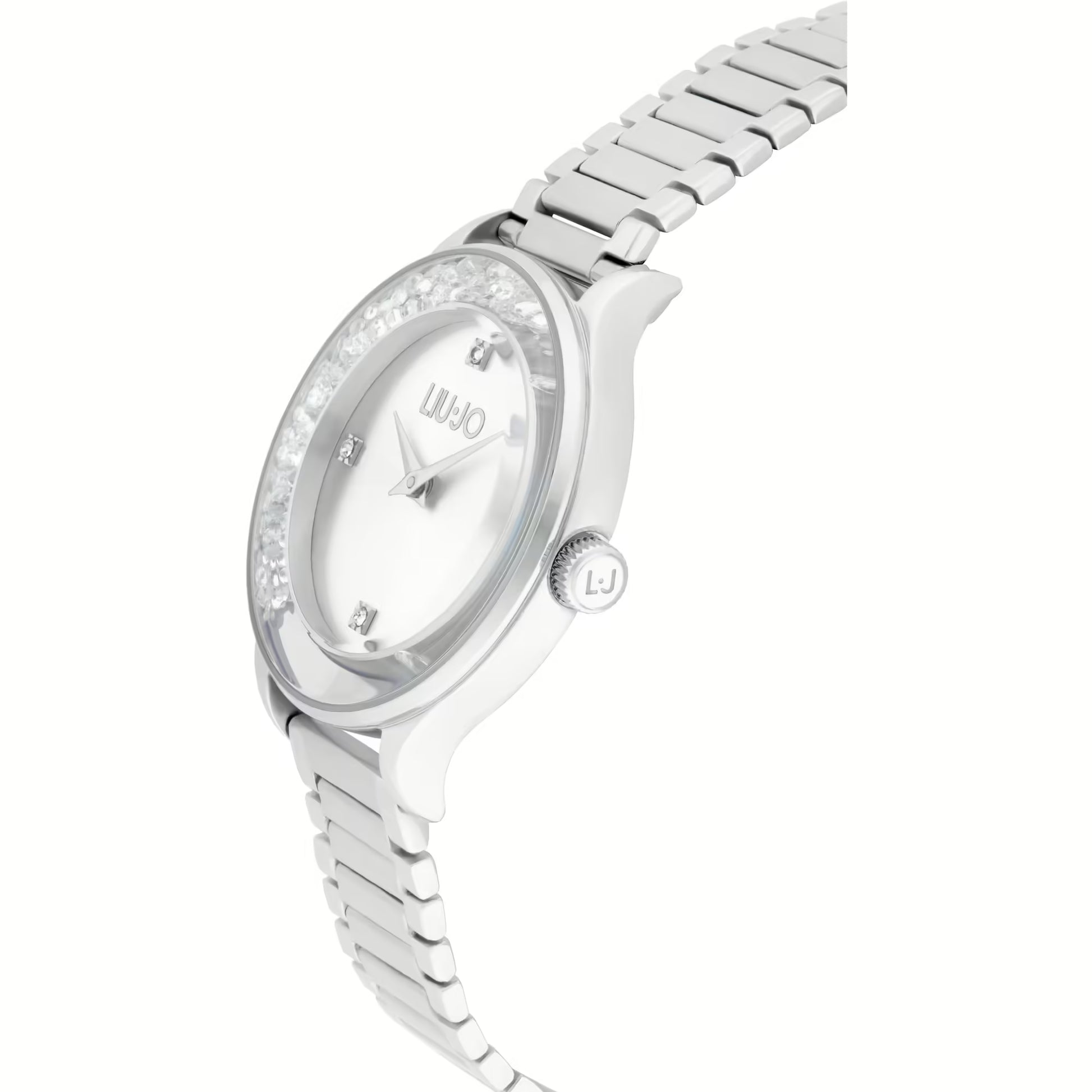 Orologio da donna di LiuJo della collezione Dancing Shine. Orologio 2 hands con movimento Miyota cal. GL24. La cassa è in acciaio di colore argento dal diametro 32,5 mm. Il vetro è menerale. Il colore del quadrante è argento con esclusivi cristalli mobili sulla lunetta. Il cinturino è in acciaiodi colore argento . La resistenza all'acqua è di 3 ATM. La referenza è TLJ2340
