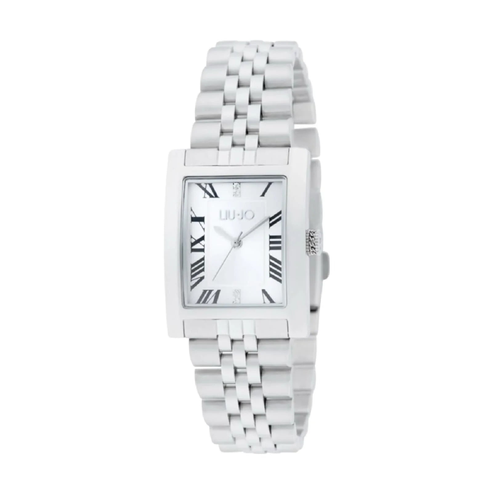 Orologio solo tempo della collezione Liu Jo Casual Imperia da donna. Colore della cassa: argento; colore del quadrante: argento; colore del bracciale: argento. Cassa rettangolare di diametro 24,5 x 32,5 mm in acciaio inossidabile 316L. Quadrante argento con numeri romani di colore nero. Vetro minerale. Bracciale in acciaio inossidabile 316L con chiusura deployante. Movimento al quarzo. Classificazione di impermeabilità (WR) 3 bar: resistente agli schizzi d’acqua ed alla pioggia, ma non sotto pressione.