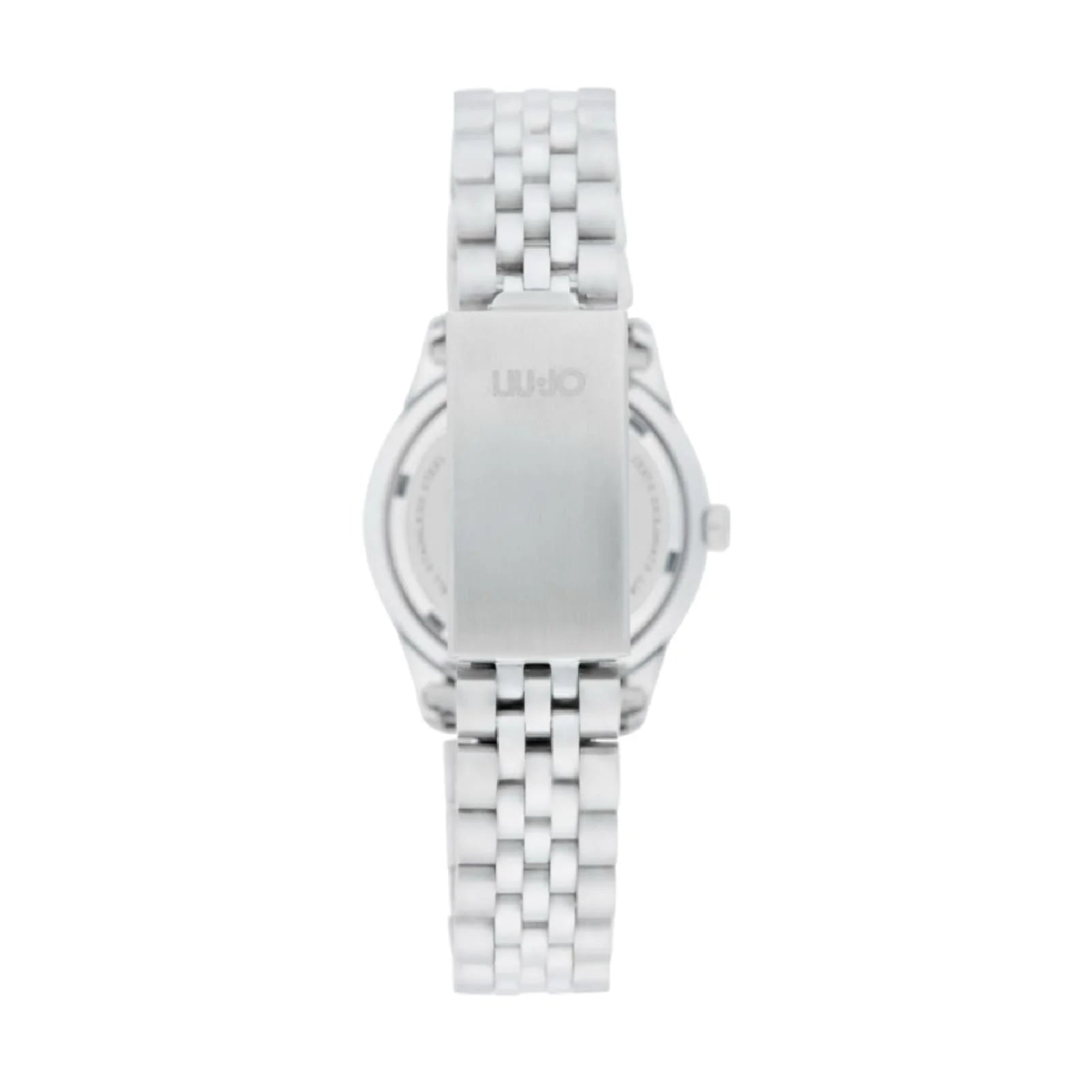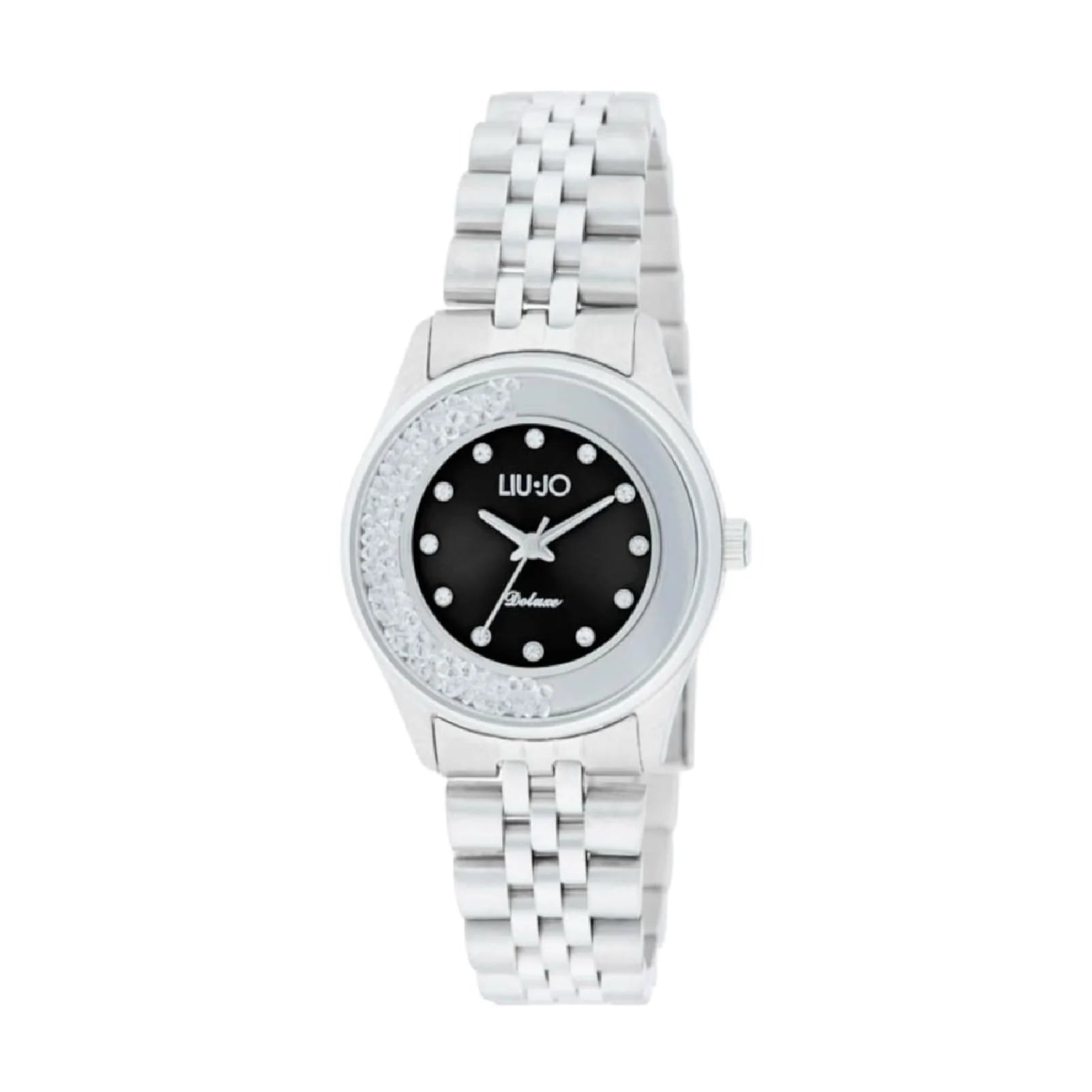 Orologio solo tempo della collezione Liu Jo Dancing Elvy da donna. Colore della cassa: argento; colore del quadrante: nero; colore del bracciale: argento. Cassa di diametro 30 mm in acciaio inossidabile 316L. Quadrante nero impreziosito lateralmente da cristalli. Vetro minerale. Bracciale in acciaio inossidabile 316L con chiusura deployante. Movimento al quarzo. Classificazione di impermeabilità (WR) 5 ATM: resistente sotto la doccia.