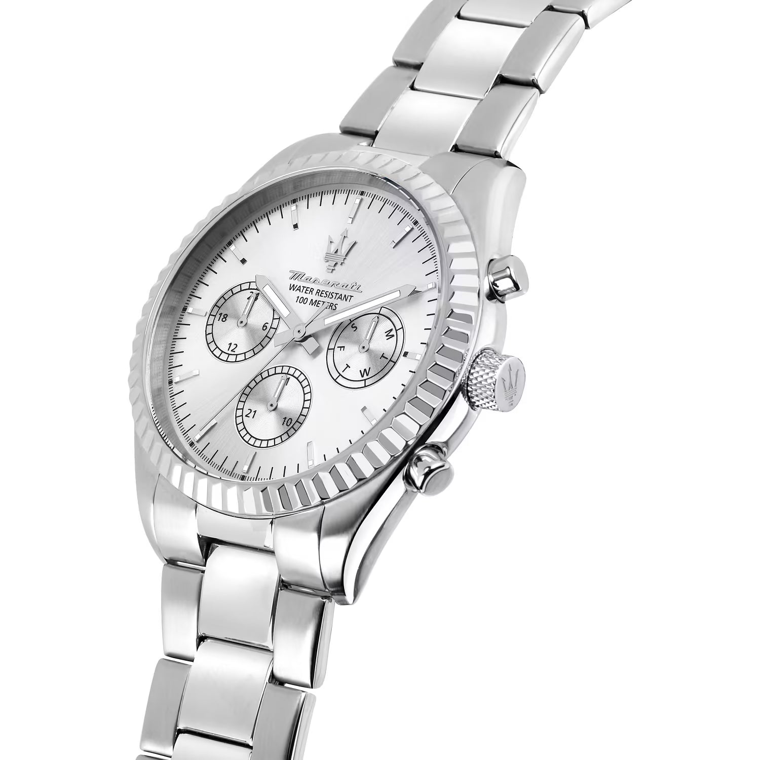 Genere: Uomo, Materiale e finitura cassa: Acciaio, Misura cassa: 43.00mm, Spessore cassa: 11.00mm, Colore cassa: Silver, Vetro: Vetro minerale, Materiale cinturino: Acciaio, Colore cinturino: Silver, Chiusura: Fibbia diver, Movimento: Quarzo, Water resistant: 10 atm, Garanzia: Ufficiale 2 anni Maserati, Confezione: Originale Maserati
