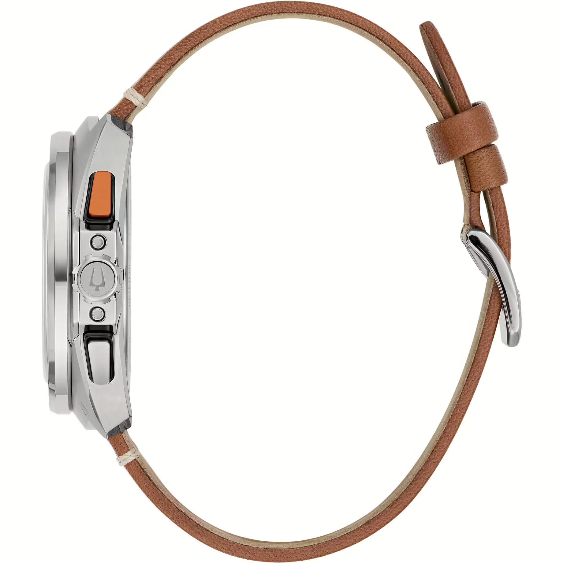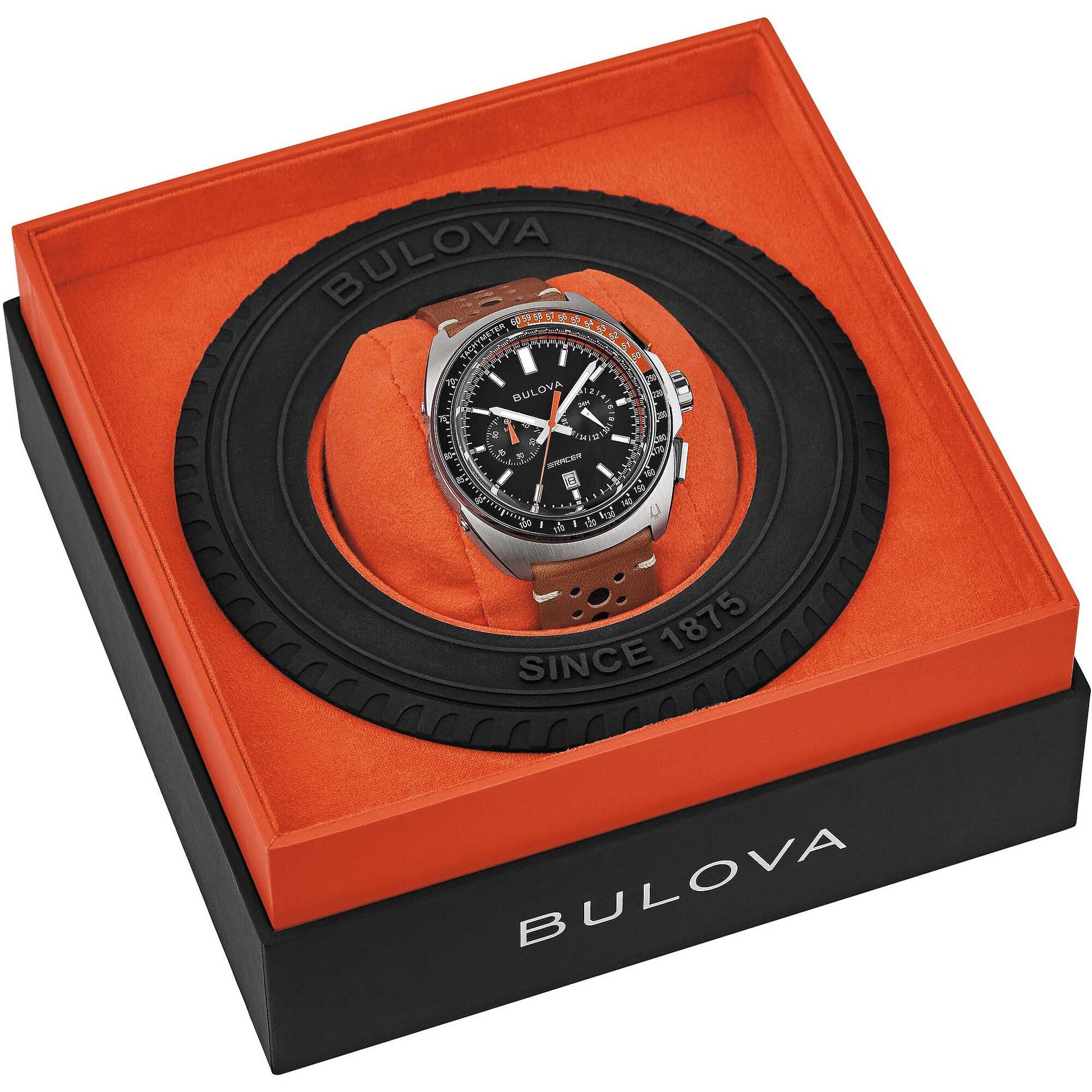 Orologio cronografo da uomo di Bulova della collezione Racer. Il materiale della cassa è acciaio di misura 42 mm. Il materiale del cinturino è pelle traforata di colore marrone. La chiusura del cinturino è ardiglione. Gli indici sono a tacche. Il movimento è quarzo. La resistenza all'acqua è di 100 metri. La referenza è di 98B427