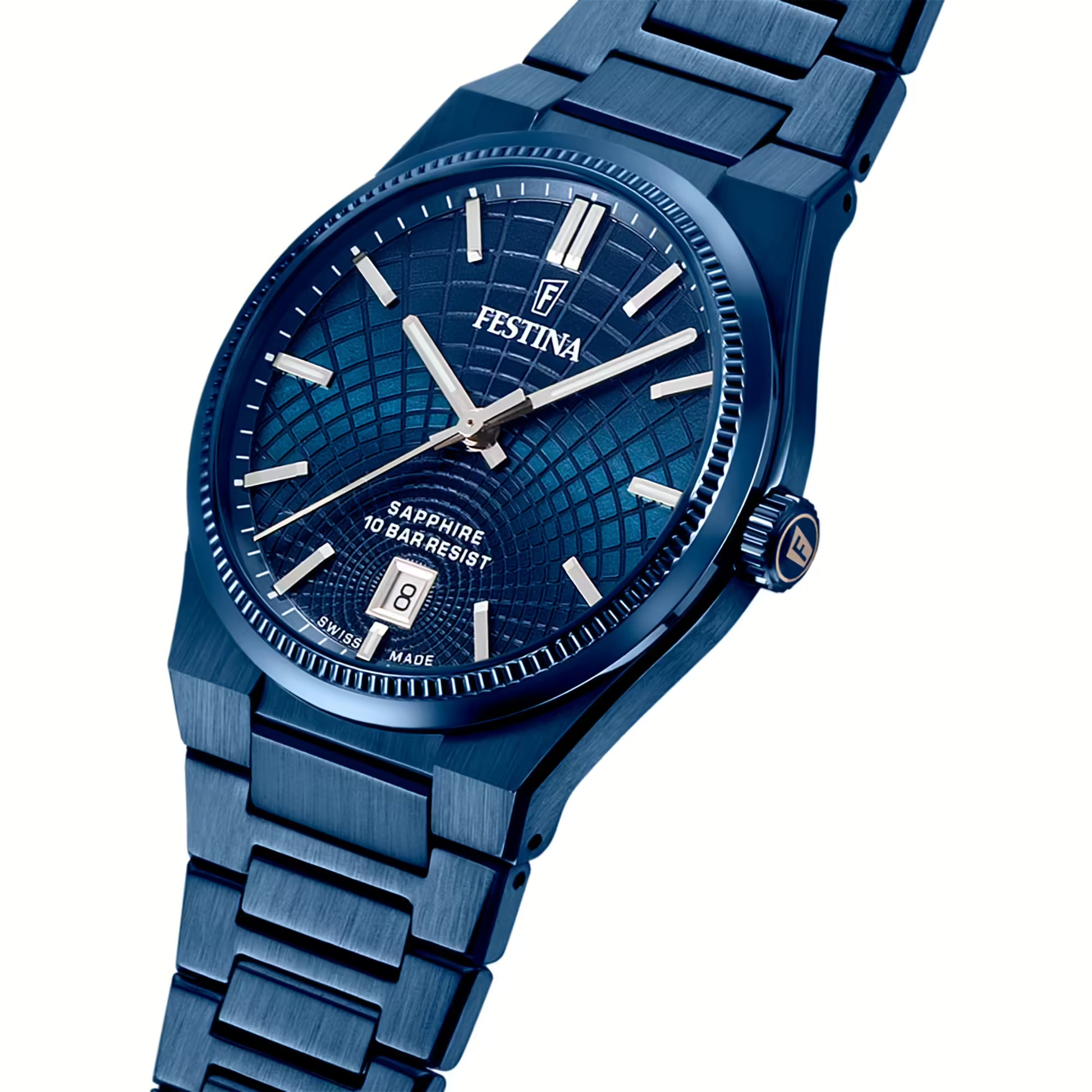 Orologio ore e minuti di Festina da uomo della collezione Rive Collection. Orologio realizzato in acciaio con cassa di forma rotonda di misura 40 mm e spessore 8,75 mm con vetro zaffiro. Quadrante di colore azzuro con indici di colore grigio. Cinturino realizzato in acciaio inossidabile 316l di colore blu con chiusura déployante. Funzioni: ore e minuti. Movimento al quarzo analogico. La resistenza all'acqua è 10 ATM. La referenza è F20078/1