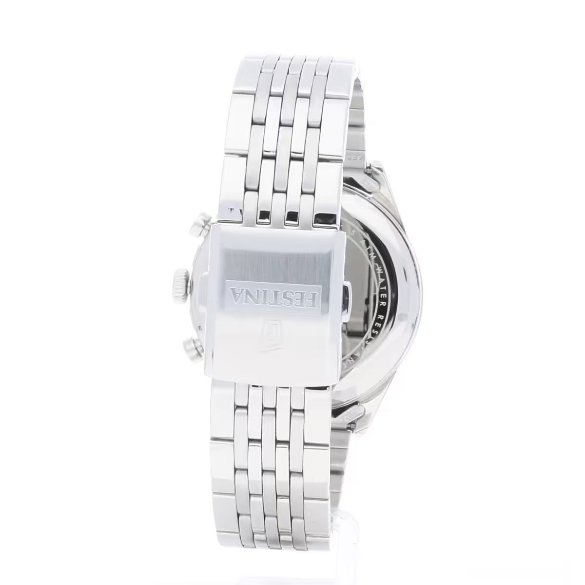 Orologio cronografo di Festina da uomo della collezione Timeless Chronograph. Orologio cronografo con cassa in acciaio inossidabile 316l di forma rotonda con diametro di 41.5 mm e spessore di 10,4 mm. Quadrante di colore blu e vetro minerale. Cinturino in acciaio inossidabile 316l di colore argento con chiusura deployante. Funzione: cronografo. La resistenza all'acqua è garantita fino a 5 ATM. Il movimento è al quarzo. La referenza è F20285/3
