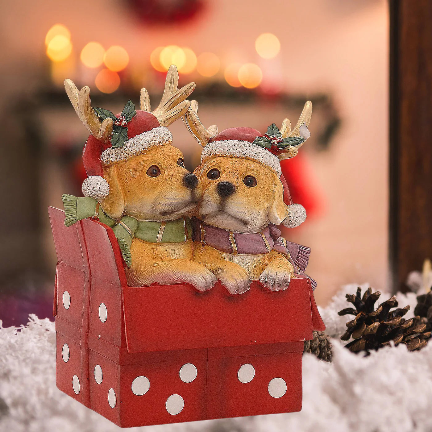 Questo bellissima scultura saprà impreziosire la vostra casa nelle festività natalizie. I dettagli sono fantastici. La scultura è realizzata in resina e rappresenta una scatola regalo natalizia, ma al suo interno vi sono due graziosi cagnolini adornati come renne. L'altezza totale è di 24,5 cm.